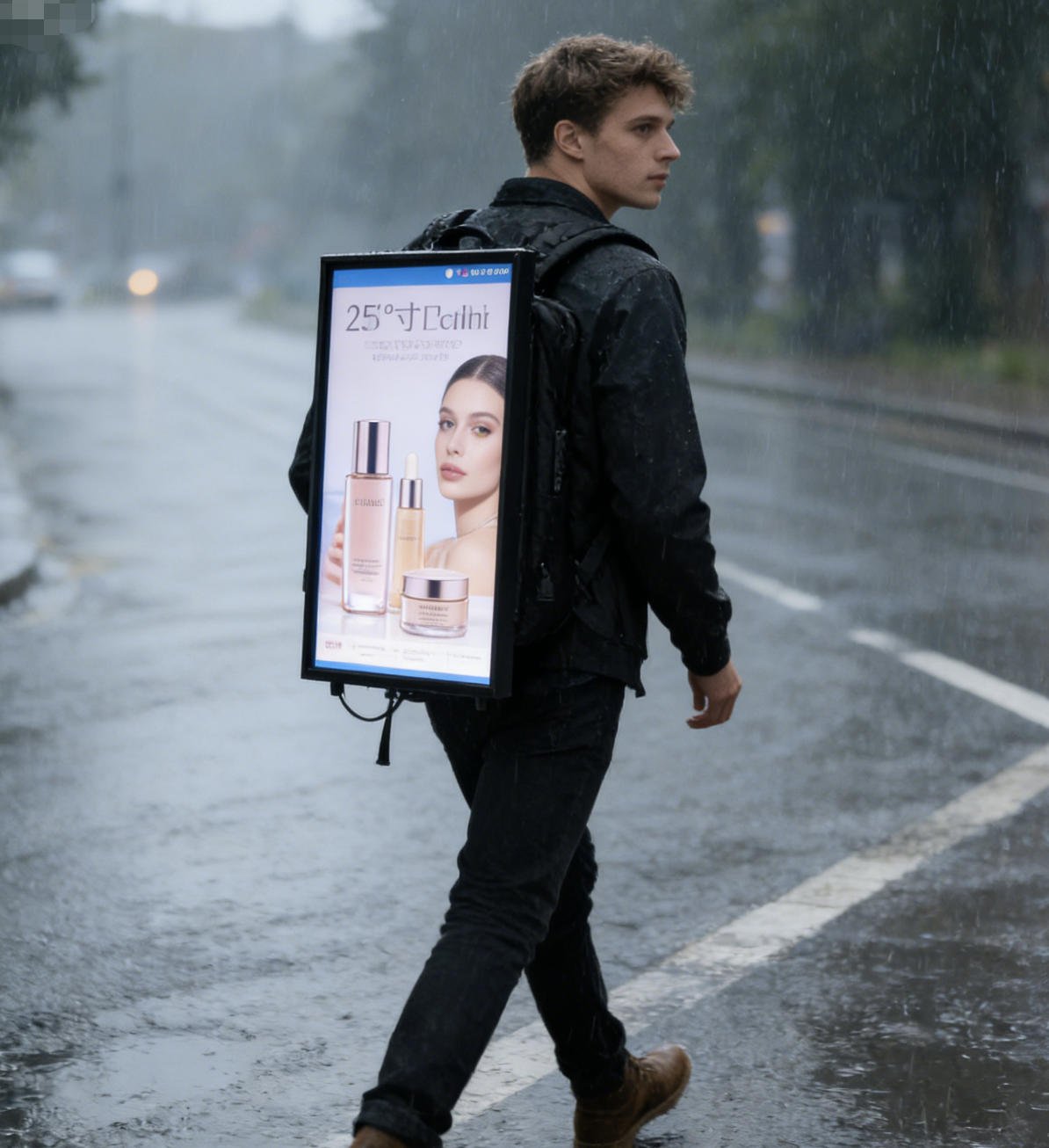 Figure 1: An AIMV LCD Backpack worn by a brand representative at an urban promotional event, showcasing vibrant, high-definition brand content. The sleek, ergonomic design is complemented by the AIMV logo subtly displayed on the screen bezel. (Alt: AIMV LCD Backpack in Action for Mobile Brand Promotion)