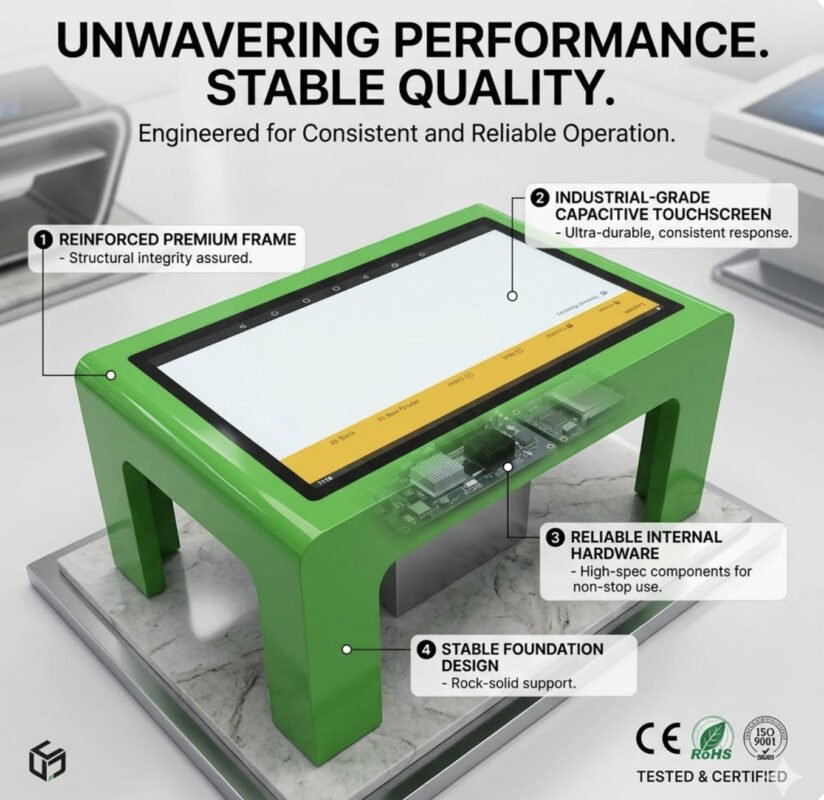 Designed for long-term commercial use, our Touch screen Table adopts industrial-grade hardware components and a robust metal chassis, supporting several users to operate together.  The kiosk has good dustproof and waterproof performance (IP65 rating), effectively adapting to complex store environments. The optimized thermal management system ensures stable operation even in high-temperature environments, reducing failure rates and maintenance costs for businesses.