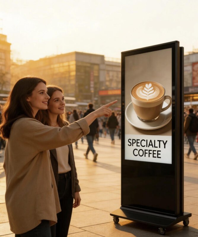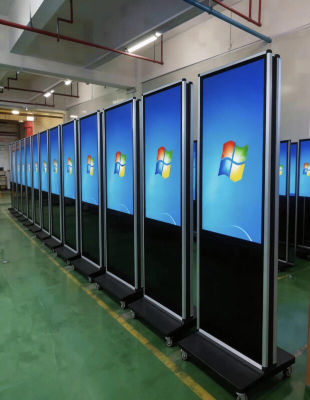 Maximize audience engagement with our 32″-86″ dual sided floor standing digital signage. Featuring optional touch screens, detachable wheels for easy mobility, and the ability to display the same or different content on both sides. Ideal for malls and airports.