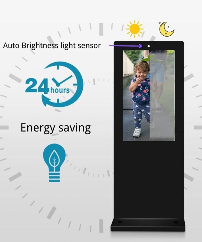In addition to IP65 waterproof and wide temperature protection, our floor standing IP65 outdoor digital signage is built with industrial-grade hardware, with a service life of more than 50,000 hours, an average MTBF (Mean Time Between Failures) of 40,000 hours, and a 5-year warranty, ensuring long-term stable operation without frequent maintenance. This high brightness outdoor digital signage adopts an energy-saving design, which reduces power consumption while maintaining excellent display effects, meeting international energy efficiency standards and reducing long-term operation costs for users. The anti-UV panel design also effectively prevents screen fading and aging, ensuring the display effect remains clear and vivid for a long time.