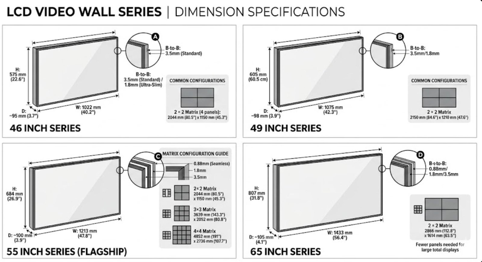 Available Panel Sizes: 46″, 49″, 55″, 65″ (Standard 16:9 Aspect Ratio).