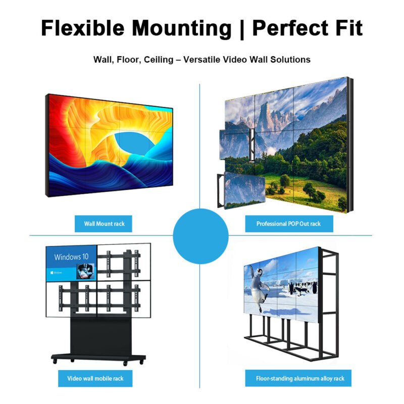 - Every 46” 49” 55” 65” commercial LCD video wall is equipped with industrial-grade LCD panels, supporting full HD (1920×1080) or optional 4K resolution, ensuring sharp text, intricate graphics, and vivid colors even when viewed up close on large matrices. With a native contrast ratio of up to 3500:1 and peak brightness of 700 nits, the slim bezel LCD video wall reveals subtle shadow details while resisting glare, making it suitable for both bright public spaces and dim control rooms.